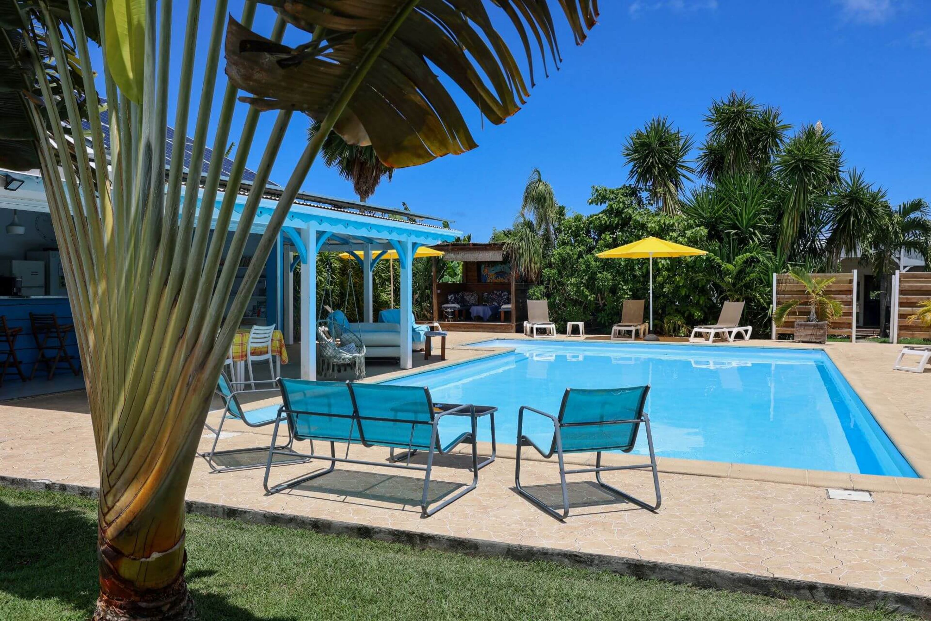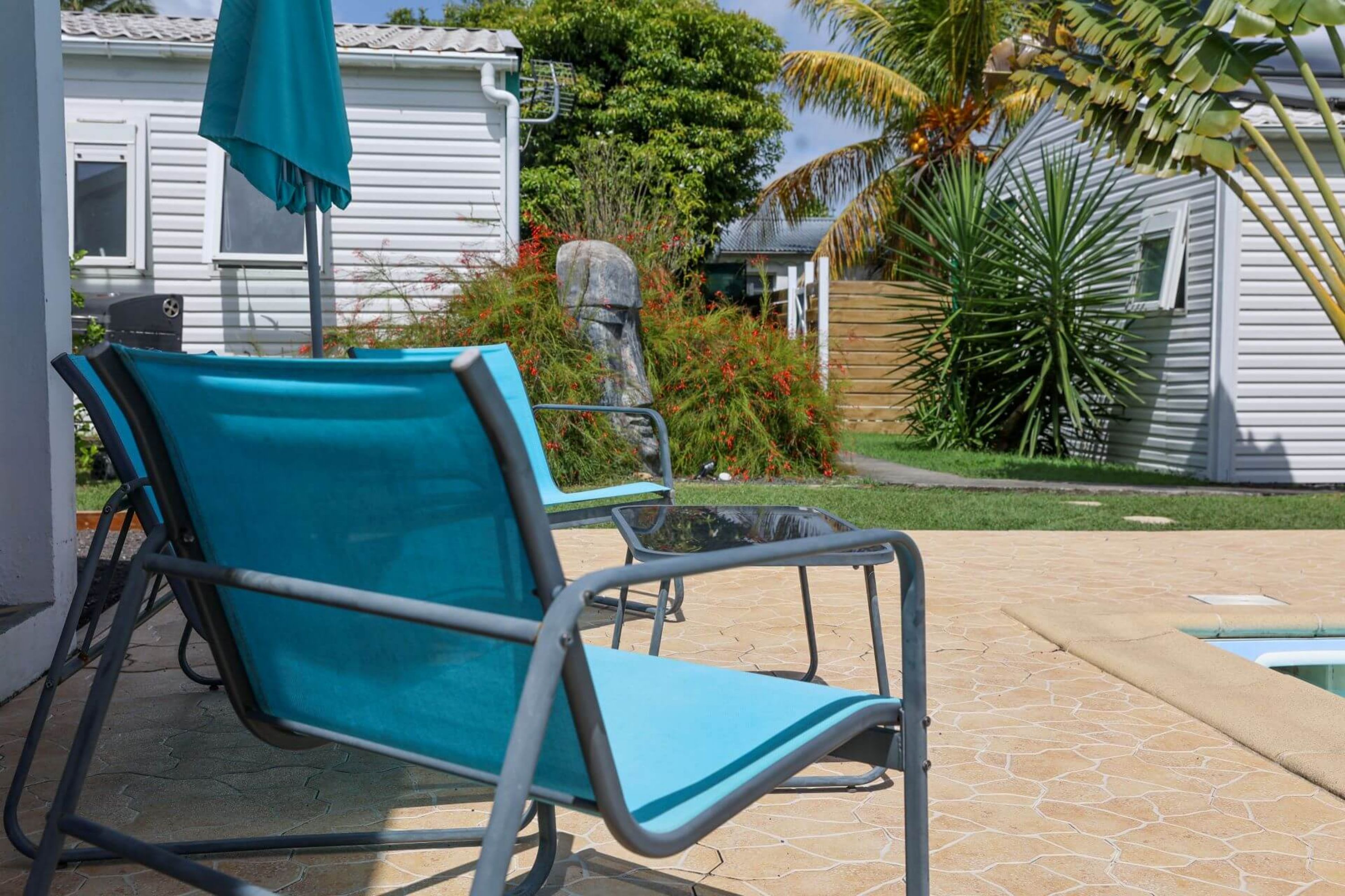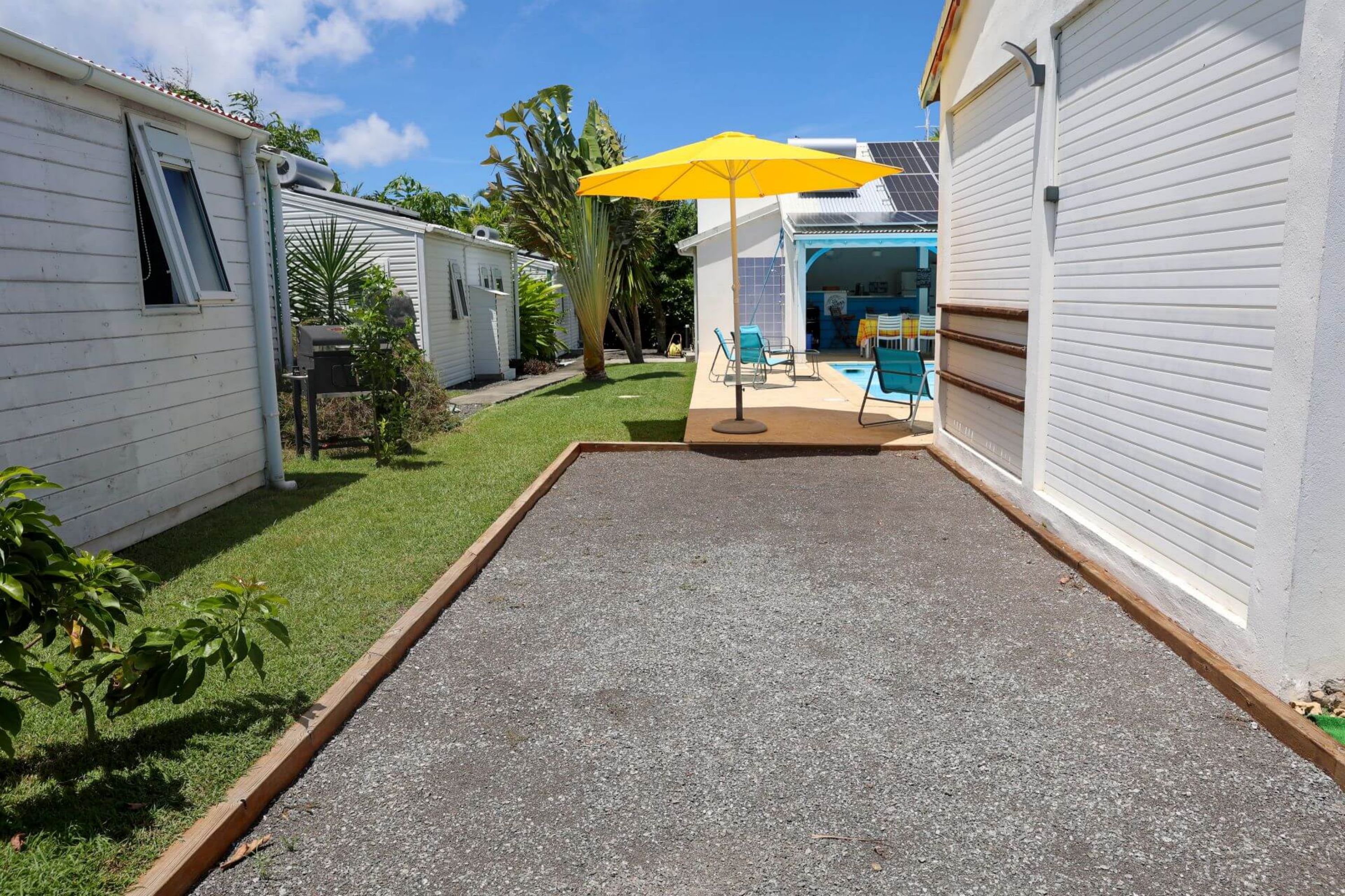 Côté extérieur, chaque hébergement dispose d'une terrasse et d'un jardin avec barbecue et mobilier, au milieu de plants et d'arbres exotiques dans une ambiance créole. A disposition des résidents : salle de jeux, piscine privée, terrain de pétanque.